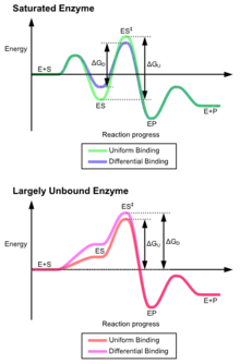 وقد أدت هذه الآثار إلى استخدام معظم البروتينات لآلية الربط التفاضلي للحد من طاقة التنشيط، لذلك تشمل معظم الركائز على تقارب عالي للإنزيم بينما هي في حالة الانتقال.يتم تنفيذ الربط التفاضلي بواسطة آلية التناسب المُستحثة - ترتبط الركيزة أولاً بشكلٍ ضعيف، ثم يُغير الإنزيم التشكل مما يزيد من تقارب حالة الانتقال والاستقرار، وبذلك يُحد من طاقة التنشيط للوصول إليه.