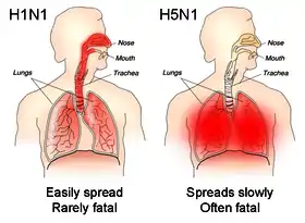 بروتين هيماجلوتينين الفيروسي هو المسؤول عن تحديد الأنواع التي يمكن أن تصيبها السلالة، السلالات التي تنتقل بسهولة بين الناس لديها بروتينات هيماغلوتينين ترتبط بمستقبلات في الجزء العلوي من الجهاز التنفسي، كما هو الحال في الأنف والحنجرة والفم. في المقابل، فإن سلالة H5N1 الفتاكة للغاية ترتبط بمستقبلات توجد في الغالب في الرئتين ( في الجزء العميق منه). هذا الاختلاف في موقع العدوى قد يكون جزءا من السبب في أن سلالة H5N1 تسبب الالتهاب الرئوي الفيروسي الشديد في الرئتين، ولكن لا ينتقل بسهولة من قبل الناس بالسعال أوبالعطس.[85][86][87][88]