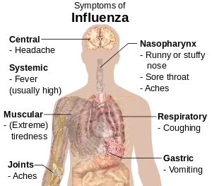 الأنفلونزا، والمعروفة باسم "النزلة الوافدة" أو الخُنان، هو مرض معدي تسببه فيروسات مخاطية قويمة.[3] أعراض الأنفلونزا يمكن أن تكون خفيفة أو قوية جدا.[4] تشمل الأعراض : حمى، ثر أنفي، التهاب الحلق، ألم عضلي، صداع، سعال وإعياء. تبدأ هذه الأعراض عادة بعد يومين من التعرض للفيروس، وتستمر لمدة أقل من أسبوع. ولكن السعال قد يستمر لأكثر من أسبوعين.[3] في الأطفال، قد يكون هناك غثيان وتقيؤ، ولكن هذه الأعراض ليست شائعة لدى البالغين. يحدث الغثيان والقيء بنسبة أكبر بسبب التهاب المعدة والأمعاء الناتجين عن العدوى، وهو ما يشار إليه أحيانا باسم "انفلونزا المعدة" أو "انفلونزا على مدار 24 ساعة".[5] تشمل مضاعفات الأنفلونزا ما يلي : الالتهاب الرئوي الفيروسي والالتهاب الرئوي الجرثومي الثانوي، والتهابات الجيوب الأنفية، وتفاقم المشاكل الصحية السابقة مثل الربو أو قصور القلب.[4][6]