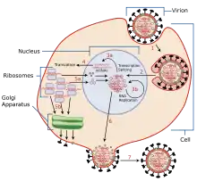 تشكل البروتينات الأساسية و (vRNA) مركب معقد يتم نقله إلى نواة الخلية، حيث يبدأ الحمض النووي الريبي التي يعتمد على بوليميراز الحمض النووي الريبي النسخ التكميلي للحمض النووي الريبي الإيجابي الفردي (الخطوة 3 ). يخرج (vRNA) إلى السيتوبلازم ويتم ترجمته (الخطوة 4) أو يظل موجوداً في النواة. يتم إفراز البروتينات الفيروسية المصنعة حديثا من خلال جهاز غولجي على سطح الخلية أو نقلها مرة أخرى إلى النواة لربط (vRNA) وتشكيل الجسيمات الجينومية الفيروسية الجديدة (الخطوة 5 أ). البروتينات الفيروسية الأخرى لها إجراءات متعددة في الخلية المضيفة، بما في ذلك استخدام النوكليوتيدات لـ ترجمة ال (vRNA).[69][70]