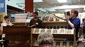في متجر باول في بورتلاند (أوريغون). داشنر (في الوسط) يقرأ عودة جيدي دوث مع زميل دراسة سابق (في اليسار) و عضو من الجمهور من ثانوية لنكولن (في اليمين). يوليوز، 2014.
