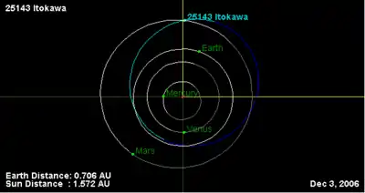 يوضح الشكل مدار الكويكب ايتكاوا حول الشمس . وقد قامت اليابان لاداء بعثتها بعد وصول المسبار الفضائي هيابوسه إليه في عام 2005 من بعد انطلاقه في عام 2000 . تم اختياره لأداء البعثة المفصلة للمسبار بأن أودع في مدار حول الشمس قريبا من الكويكب بنحو 20 كيلومتر في يوم 12 سبتمبر 2005 ، واقتصرت بعد ذلك إلى مسافة 7 كيلومتر من الكويكب. وكانت جاذبية إيتوكاوا لا تكفي لأن يكون المسبار تابع له فبقي على هذا الارتفاع يزامله في الدوران حول الشمس . ثم هبط المسبار على سطح إيتوكاوا في 20 نوفمبر لمدة 30 دقيقة ولكنه لم يفلح في تشغيل جهاز مصمم لجمع عينات من سطحه . وفي 25 نوفمبر أجريت محاولة ثانية للهبوط عليه وأخذت منه عينات في كبسولة. وأرجعت الكبسولة إلى الأرض وهبطت في "ووميرا " بأستراليا في 13 يونيو 2010 الساعة 13:51 حسب التوقيت العالمي المنسق (أي في الساعة 23:21 حسب التاوقيت المحلي في أستراليا.) وأعلنت وكالة الفضاء اليابانية في يوم 16 نوفمبر 2010 أن الكبسولة جاءت بعينات من كويكب إيتوكاوا .[9]