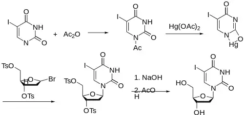 وهو عبارة عن مركب شبيه بالنيوكليسايد، شكل معدل من deoxyuridine، مشابه له بما يكفي لإدراجه في تكرار الحمض النووي الفيروسيviral DNA replication، لكن إضافة ذرة اليود إلى عنصر اليوراسيل يمنع ارتباط القواعد النتيروجينية. يتم استخدامه موضعيا فقط نظرا لسميته على عضلة القلب. تم تصنيعه من قبل Prusoff Williamفي أواخر 1950م[2] في البداية وضع باعتباره دواء مضاد للسرطان، وأصبح إيدوكسوريدين أول مضاد للفيروسات في عام 1962.[3]