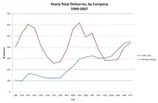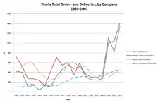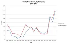 في عام 2006 فازت شركة بوينغ بالمزيد من الطلبات بكل المقاييس. وقد استعادت إيرباص التكافؤ اعتبارا من منتصف عام 2007.[5]