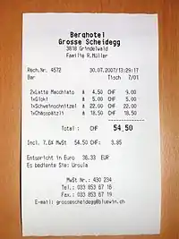 في بعض البلدان، يجب على الشركة تقديم إيصال إلى عميل يؤكد تفاصيل المعاملة. في معظم الحالات، يوفر مستلم الأموال الإيصال، ولكن في بعض الحالات يقوم الدافع بتوفيره، كما في حالة البضائع المعادة مقابل استرداد الأموال المدفوعة. الإيصال ليس هو نفسه الفاتورة.[4]