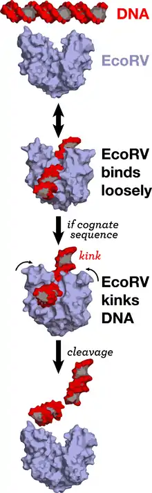 إن ارتباط هذا الإنزيم يحرض حدوث تغيرات في تركيب الحمض النووي دنا DNA، حيث يؤدي ارتباط الانزيم إلى تقوس الحمض النووي بحوالي 50 درجة تقريبا، يؤدي انحناء الحمض النووي DNA إلى تفكيك القواعد النيتروجينية وتوسيع الكهوف الصغيرة الثانوية وضغط الكهوف الرئيسية، وهذا يؤدي إلى كسر رابطة الفوسفوديستر في الموقع الفعال للإنزيم ضمن سلسلة الاعتراف على الحمض النووي دنا مما يؤدي إلى عملية قطع الدنا كما ان هذا الانزيم لا يحتاج إلى تحلل مركب الطاقة ATP.