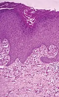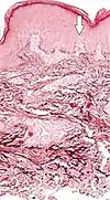 | تنكس النسيج المرن الساعي الثاقب | الألياف المرنة المتدهورة والقنوات المثقبة عبر الجلد (السهم في الصورة يشير إلى إحداها) | ![]() |