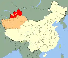 ![]() محافظة يِلي (أحمر) في شنجيانغ (برتقالي) | |