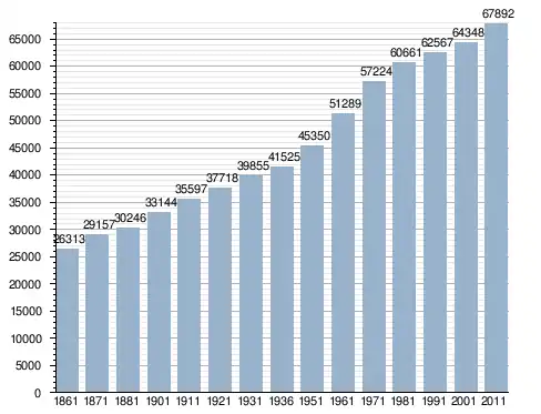 في سنة 1861 بلغ عدد السكان 26٬313 نسمة، وتطور العدد ليصل في سنة 2011 لـ 67٬892 نسمة.