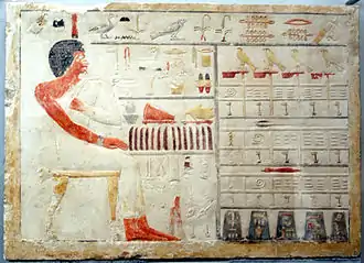 اسمه مكتوب إلي اليسار فوق راسه،ويجلس أمام منضدة زاخرة القرابين