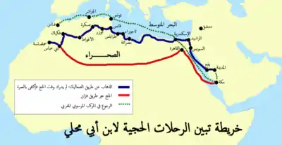 مكث حوالي ثلاث أشهر في بني عباس نوى بعدها أداء فريضة الحج (1001-1002 هـ) لكنه لم يدرك وقت الحج فاكتفى بالعمرة، في الطريق زار أبو محلي قبر عقبة بن نافع بناحية بسكرة وقبر سيدي هلال السوداني وزاوية الشيخ يحيى بن حمدون وقبر الشيخ زروق وتعرض للجوع والعطش بصحراء برقة حتى كاد يهلك فأكل عروق النباتات والجلود وشرب من ماء البحر لكن لصاً أكرمه فنجا. زار بعدها الإسكندرية والسويس ثم دخل أرض الحجاز، بعد فراغه من أداء مناسك العمرة عاد مع الركب المغربي.