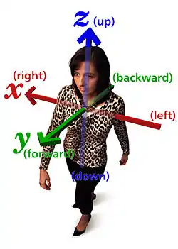 إلى الأمام وإلى الخلف يمكن تعريفهما عن طريق الإشارة إلى حركة الشئ أو الشخص. إلى الأمام يمكن تعريفه بأنه الاتجاه الذي يتحرك نحوه الجسم. إلى الخلف يمكن تعريفه إذا بأنه الاتجاه المعاكس لحركة الجسم. بالتناوب إلى الأمام يمكن أن يكون هو الاتجاه الذي تشير إليه أنف المراقب، لذا يمكن تعريف اتجاه 'الخلف' بأنه الاتجاه من الأنف إلى العظم الجداري في جمجمة المراقب. فيما يتعلق بسفينة فإن 'إلى الأمام' يشير إلى الوضع النسبي لأي جسم يقع في اتجاه حركة السفينة. بالنسبة إلى الأجسام المتناظرة، من الضروري أيضا تعريف الأمام والخلف نسبة إلى الاتجاه المتوقع.