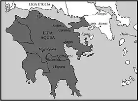 في ذلك الوقت، سيطرت مملكة مقدونيا بقيادة أنتيغونوس الثاني غوناتاس، الذي أوجد مواقع عسكرية عند نقاط إستراتيجية رئيسية مثل خالكيذا وبيرايوس وأكرونث، على مناطق في وسط اليونان والبيلوبونيز. كما عين أنتيغونوس في مدن أخرى في البيلوبونيز، وهي: آرغوس، والمدينة الضخمة حكامًا أصدقاء له اعتبرهم الآخاينيون طغاة. دعا أراطوس، الذي فقد والده على يد أولئك الطغاة، إلى تحرير هذه المدن وتأمين الدعم المالي للاتحاد من عدو أنتيغونوس بطليموس الثاني من مصر. ثم استغل المال للاستيلاء على المناطق التي تسيطر عليها مملكة مقدونية في البيلوبونيز.[4]