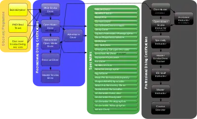 يمكن البدء في التخصصات بعد تجاوز دورة المياه المفتوحة أو دورة المياه المفتوحة المتقدم. كما يوجد العديد من برامج التخصصات في الغوص.
