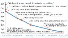 «صورة: وصفت صحيفة واشنطن بوست تصريحات ترامب بأنها تطورت من العزل العرضي إلى الاعتراف المتردد بالاستنفار العدواني على مدار فترة انتشار الوباء. على الرغم من أن ترامب تبنى أحيانًا لهجة أكثر حذرًا من مسؤولي الصحة، لكن التفاؤل الذي سيطر على رده المبكر لم يختف تمامًا، فقد قلل ترامب من خطر فيروس كورونا أكثر من 60 مرة حتى 24 يونيو 2020.»[26]