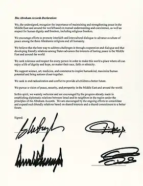 |CitationClass=تم تجاهله (مساعدة) - "Full text of the Abraham Accords signed by Israel, the UAE and Bahrain". The White House. September 16, 2020. مؤرشف من الأصل في 13 أكتوبر 2020. الوسيط