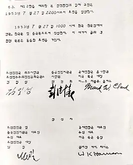 اتفاقية الهدنة الكورية (هانغل: 한국 휴전 협정) هي الهدنة وقعت في 27 يوليو 1953 بين كوريا الشمالية والصين، والولايات المتحدة على الجانب الكوري الشمالي من المنطقة المنزوعة السلاح سابقا (DMZ) والتي أدت إلى وقف تام للأعمال العدائية للحرب الكورية.[1] وتم تصميم الهدنة "لضمان وقف تام للأعمال العدائية وجميع أعمال القوة المسلحة في كوريا حتى يتم التوصل إلى تسوية سلمية نهائية".[2] على الرغم من أن كوريا الجنوبية لم توقعها، ولا يزال الجانبان في حالة حرب من الناحية النفسية حيت لم يتم التصديق على معاهدة سلام.