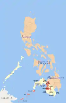 ![]() يظهر إقليم ARMM الحالي باللون الأحمر. تظهر باللون الأصفر مناطق أخرى يُقصد بها أن تكون جزءًا منها وفقًا لاتفاق طرابلس عام 1976، ولكنها تعارض إدراجها عبر الاستفتاء. | |