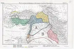 ![]() خريطة تقسيم المشرق بين المحتلين حسب اتفاقية سايكس بيكو. | |