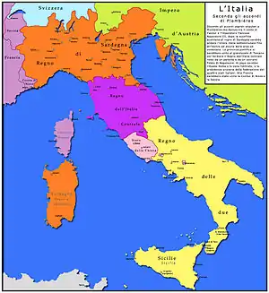 - أصبحت مملكة بيدمونت-سردينيا الحالية، جنبًا إلى جنب مع وادي بو الغني بالزراعة الممتد طول الطريق إلى نهر سوكا ، بالإضافة إلى الجزء الشمالي (الروماني) بأكمله من الولايات البابوية (ما يسمى بـ " المفوضيات البابوية ") مملكة إيطاليا العليا (" ألتا إيطاليا ") ، تحت حكم بيدمونت-سردينيا (" ... sotto la guida di Vittorio Emanuele "). [9]