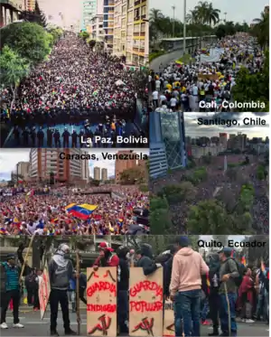 ![]() في اتجاه عقارب الساعة من أعلى اليسار: المتظاهرون في لاباز، بوليفيا في 23 أكتوبر 2019؛ العمال يسيرون في كالي، كولومبيا خلال الإضراب العام في 21 نوفمبر وما تلاه الاحتجاجات ؛ تجمع الحشود في وسط سانتياغو في تشيلي في 25 أكتوبر 2019؛ المحتجون في كيتو في الإكوادور؛ تجمع المحتجون في كاراكاس في فنزويلا في 23 يناير 2019. | |