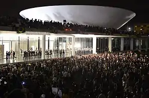 وفقًا للسلطات، تظاهر 40 ألف شخص على بعد ثلاثة كيلو مترات من ملعب تقام فيه مباراة ما قبل نهائي كأس العالم للقارات. واستخدمت الشرطة الغاز المسيل للدموع. وأمام مبنى الكونغرس في برازيليا، رمى المحتجون رجال الشرطة بكرات القدم احتجاجًا على الحكومة التي أنفقت مليارات لبناء استادات جديدة لبطولات كرة القدم العالمية.[5]