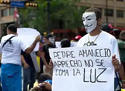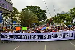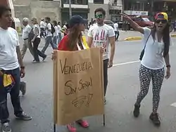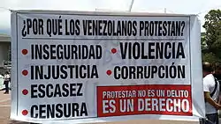 لافتة تشرح أسباب احتجاج المعارضة "لماذا تحتج فنزويلا؟ لاانعدام الأمن والظلم ونقص الرقابة والعنف والفساد. الاحتجاج ليس جريمة. هل هو حقا كذلك ؟".