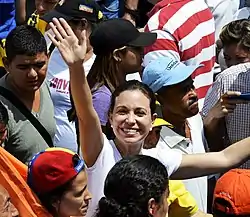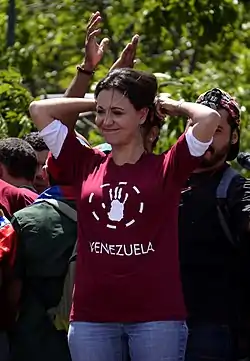 - 24 مارس - ألقى الرئيس مادورو باللوم على جميع القتلى خلال الاحتجاج على محاولة "الانقلاب"، وقامت مجموعة مكونة من 70 من المتظاهرين الشباب بإنشاء خيام بالقرب من مدخل مقر الأمم المتحدة في لوس بالوس غرانديز، وأعلن رئيس الجمعية ديوسدادو كابيلو أن ماريا كورينا ماتشادو لم يعد بإمكانها الانخراط في الجمعية الوطنية نائبا، وبالتالي طردها وفقا لقواعد الجمعية العامة وامتثالا للمادتين 149 و 191 من دستور فنزويلا التي تنص على أن " لا يسمح للموظفين بقبول عمل أو تكريم أو مكافآت من حكومات أجنبية دون إذن من الجمعية الوطنية "وبأن" لا يسمح لنواب الجمعية الوطنية بقبول أو شغل وظائف عامة دون التخلي عن تعيينهم.[237][238][239] قالت ماريا كورينا ماتشادو إنها ستكون نائبة طالما أرادها الناس.[240][241][242]