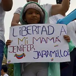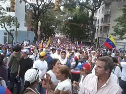 مسيرة للمعارضة لدعم يوبولدو لوبيز. - 19 مارس / آذار - استمرت الأمهات في الاحتجاج سلميا وهم يرددون "نريد أن نحرر الأطفال" في ميدان ألتاميرة، بدأ الطلاب في الحصول على درجة في ساحة ألتاميرة عندما بدأ أستاذ تدريس مادة الرياضيات للطلاب في المنطقة، في روبيو، ذكر رئيس المجلس البلدي روبيو أن حوالي 150 متظاهر تجمعوا وأطلقوا النار عليهم من قبل الحرس الوطني الذي خلف جروح وإصابات برصاصة شملت طفلين من عمر 1 و 3 سنوات على التوالي، وقتل عامل في شركة الخدمات أثناء قيامه بتطهير حاجز في كراكاس، دخلت كولكتيفوس داخل كلية العمارة والعمران في كوف، وضرب الطلاب وإلحاق الضرر المرافق، كما تم سرقة الطلاب وأخذوا ملابسهم، وأبلغت مديرة الجامعة سيسيليا غارسيا أروشا أن الصفوف ستوقف مؤقتا بسبب أعمال العنف الأخيرة، سافرت ماريا كورينا ماتشادو إلى واشنطن للمشاركة في دورة منظمة الدول الأمريكية بعد قبول عرض حكومة بنما للتنازل عن مقعدها في المنظمة.[169][202][203][204][205][206][207][208]