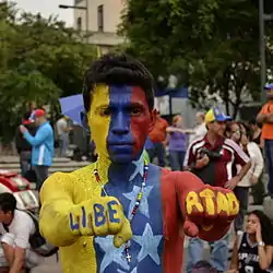 - 12 أبريل - ارتدى الآلاف من المتظاهرين المعارضين في مجموعات منفصلة لون مختلف من الأحمر والأصفر والأزرق وبدأوا في الظهور في كاراكاس بعد أن دعتهم ماريا كورينا ماتشادو للاحتجاج.[320]