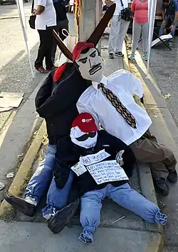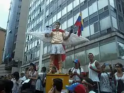 - 20 أبريل - خلال احتفالات عيد الفصح التقليدية لحرق يهوذا، أحرق بعض المتظاهرين المناهضين للحكومة نوبات الرئيس مادورو ومسؤولين حكوميين آخرين يقولون إنهم خانوا الشعب الفنزويلي كما خان يهوذا إسكاريوت يسوع، وسار المتظاهرون إلى مقر برنامج الامم المتحدة للتنمية المسمى "قيامة الديموقراطية" حيث اوضحت ماريا كورينا ماتشادو ان "العالم كله يدرك اننا نكافح من اجل الديموقراطية وان نعطي الحرية، ويدين العالم كله الضربة التي تعرض لها البرلمان في هذه الأوقات عندما يمنعني من الدخول "وقال أنطونيو ليديزما أنه" لا يكفي للصلاة، عليك أن تخرج وتحارب من أجل تحقيق قيامة الديمقراطية، والتحالف التاريخي من العمال والطلاب في طليعة هذا النضال من أجل بلد أفضل ".[338][339][340] احتج سكان كارابوبو على لافتات وأعلام للتحسينات الاجتماعية وأدانوا النقص في تأثيرهم، وقعت اشتباكات بين المتظاهرين والحرس الوطني.[341][342][343][344]