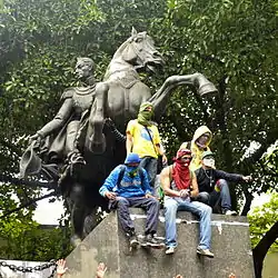 الاحتجاجات أمام الشرطة- ألتاميرة، سكوار. - 12 مارس - أغلق مترو كراكاس سبع محطات بسبب مخاوف تتعلق بالسلامة.[161] وسار طلاب جامعة كاليفورنيا (جامعة فنزويلا المركزية بالاسبانية) ومظاهرات المعارضة إلى ساحة فنزويلا للمطالبة بسعادة أمبادوسومان غابرييلا راميريز للاستقالة، فرقت الشرطة الاحتجاج بالقنابل المسيلة للدموع ومدافع المياه.[162][163][164][165] وفي تشاساو، فرقت ست دبابات وشاحنتان مدفعتان بالمياه وحراس من الحراس الوطنيين بالغاز المسيل للدموع وقذائف البنادق المتظاهرين أثناء تشغيل صوت هوغو شافيز وصوت النشيد الوطني الكوبي.[166] وقد أفادت منظمة "NTN24" بأن رجال الحرس الوطنيين والأفراد الذين يحملون "لهجات كوبية" في ميريدا أجبروا ثلاثة مراهقين معتقلين على الاعتراف بالجرائم التي لم يرتكبوها، ثم "راكعوا المراهقون وأجبروا على رفع أسلحتهم ثم أطلقوا النار عليهم في جسدهم" خلال مزاعم "الممارسة المستهدفة".[167][168] وذكر حاكم ولاية كارابوبو فرانسيسكو اميلياك ان قائد الحرس الوطنى راموس ارنستو براشو برافو لقى مصرعه بعد اطلاق النار عليه في طريق فالنسيا السريع. وقتل اثنان من المارة، أحدهما إلى المخزن وواحد داخل شقة، بعد أن أطلق عليهما عدة عشرات من الكولكتيفوس على دراجات نارية كانوا يهاجمون المتظاهرين المعارضين في إيزابيليكا، فالنسيا.[169][170][171][172] وندد الرئيس مادورو بأن جماعات العنف من المتظاهرين المعارضين هاجموا البرج البريطاني في ألتاميرة.[173][174][175]