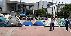 - 31 مارس - وضع المتظاهرون الطلاب خيام خارج مدخل مقر الأمم المتحدة في كراكاس يسألون لماذا لم يعطوا اهتمام لبلدهم.[263] كما حجب طلاب جامعة فنزويلا المركزية طريق فرانسيسكو فاجاردو السريع أثناء الاحتجاج.[264] ودعا النواب والطلاب إلى التجمع في اليوم التالي لمرافقة ماريا كورينا ماتشادو لحضور اجتماع للجمعية الوطنية.[265]