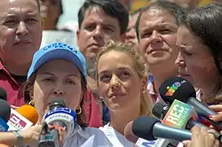 ماريا كورينا ماشادو وليليان تينتوري، اللتين تدعمان السيدة ميتزي كابريلز دي ليديزما، زوجة عمدة مدينة كاراكاس في اجتماع عقد في 20 شباط / فبراير.