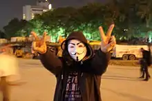 منظاهر يرتدي قناع جاي فوكس - 22 مايو: أصدرت مجموعة القراصنة التركية ريدهاك وثائق سرية تخص الدرك التركي. ووفقًا للوثائق، فإن منظمة المخابرات الوطنية (تركيا) والدرك التركي والمديرية العامة للأمن عرفت أن الهجوم سيكون قبل شهر واحد.