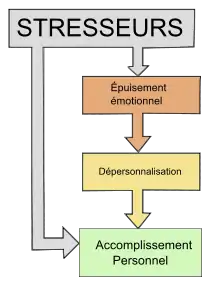وقد ظهر، في مطلع القرن الحادى والعشرين، إجماع[32] يؤكد أن متلازمة الاحتراق النفسى الوظيفى تبدأ بالشعور بالإنهاك الوجدانى الذي يؤدى بالتالى إلى سلب الشخصية. ويقلل الإنهاك الوجدانى من الإنجاز الشخصي[33]، إما بشكل مباشر أو من خلال سلب الشخصيةقالب:Ancre. كما يمثل الإنهاك الوجدانى العنصر العاطفي لمتلازمة الاحتراق النفسى الوظيفى، بينما يمثل البعدين الآخرين، سلب الشخصية وتدنى الإنجاز الشخصي عناصرسلوكية أو معرفية[34]..