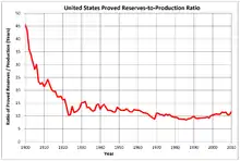 وبلغت نسبة الاحتياطيات إلى الإنتاج 11.26 سنة في عام 2007. وبلغت هذه النسبة 11.08 سنة في عام 1970. وبلغت قاعها 8.49 سنة في عام 1986 عندما بدأ ضخ النفط عبر خط أنابيب ألاسكا إلى الذروة.[6]