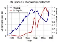 ويمثل صافي واردات النفط والمنتجات ما يقرب من نصف العجز التجاري في الولايات المتحدة وبسبب تراجع اإلنتاج وزيادة الطلب ارتفعت الواردات الصافية من النفط والمنتجات النفطية من 3.16 مليون برميل يوميا) 502 × 103 م 3 / د (في عام 1970 إلى 12.04 مليون برميل يوميا) 1.914 × 106 م 3 / د (في عام 2007، قبل الانخفاض. وكان أكبر موردين صافيا للمنتجات النفطية في عام 2007 هما كندا والمكسيك اللتين وفرتا 2.2 و 1.3 مليون برميل يوميا (350 × 103 و 210 × 103 متر مكعب / اليوم) على التوالي.[11] اعتبارا من عام 2011 استهلكت الولايات المتحدة 18.8 مليون برميل من المنتجات النفطية يوميا، واستوردت صافي 8.4 مليون برميل يوميا؛ ذكرت وكالة الطاقة الأمريكية أن "الاعتماد على صافي واردات النفط" في الولايات المتحدة في عام 2011 هو 45٪.[12] وخلال الفترة 2008-2009 أصبحت الولايات المتحدة مصدرا صافيا للمنتجات النفطية المكررة؛ قبل أن تشتري الولايات المتحدة البنزين والديزل والكيروسين في أوروبا وكميات أقل من بلدان أخرى.