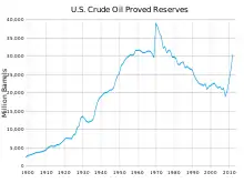 وكانت احتياطيات النفط الأمريكية المؤكدة 26.5 مليار برميل (4.21 × 109 م 3) اعتبارا من عام 2011. وتمثل بيانات عام 2011 زيادة بنسبة 39٪ في الاحتياطيات المؤكدة منذ عام 2008 [1] ولكنها أقل بنسبة 32٪ من 39 مليار برميل (6.2 × 109 م 3 ) من الاحتياطيات المؤكدة في عام 1970 عندما تم العثور على حقل خليج برودو العملاق في ألاسكا.[4]