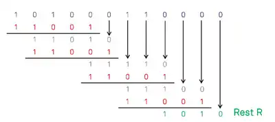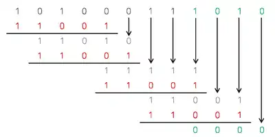 يتم إضافة عدد معين من الأصفار على الكود المرسل عددها نفس عدد كثيرة الحدود للبت المساعدة.بعدها عن طريق باقي القسمة على 2 مع CRC أو (mod 2)، يتم إضافة الباقي (Rest) في الكود المرسل ويتم ارسالها إلى المستقبل. في المستقبل يتم من خلال قسمة الكود المرسل على الكود CRC معرفة إذا ما كان هناك خلل بالأرسال أم لا، واذا كان باقي القسمة صفر فهذا يدل ان الكود المرسل لم يحصل به اخطاء.