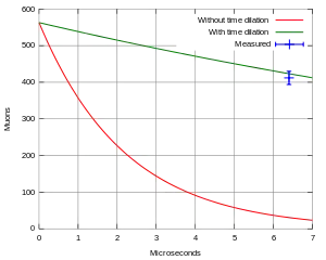 إذا لم يكن هناك تمدد زمني، فيجب أن تتحلل هذه الميونات في الغلاف الجوي العلوي، ونتيجة لتمدد الزمن، فإنها موجودة بكميات كبيرة أيضًا على ارتفاعات أقل بكثير من ذلك. تسمح مقارنة هذه الكميات بتحديد متوسط العمر الافتراضي وأيضًا عمر النصف للميونات. هو عدد الميونات المقاسة في الغلاف الجوي العلوي، و على مستوى سطح البحر، و هو وقت السفر في الإطار المتبقي للأرض الذي تقطع به الميونات المسافة بين تلك المناطق، و هو متوسط العمر المناسب للميونات.[3]