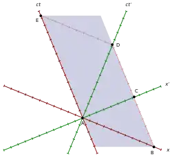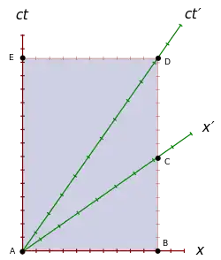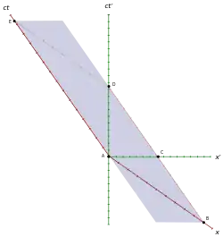 يظهر الميون في (A) عن طريق تصادم الإشعاع مع الغلاف الجوي العلوي. إن الميون في حالة سكون في S'، لذا فإن خطه العالمي هو المحور ct'. وإن الغلاف الجوي العلوي في حالة سكون في S، لذا فإن خطه العالمي هو المحور ct. عند محوريّ x وx'، كل الأحداث موجودة متزامنة مع A في S وS'، على الترتيب. يلتقي الميون والأرض في D. بما أن الأرض في حالة سكون في S، يُرسم خطها العالمي (المطابق للغلاف الجوي السفلي) موازيًا للمحور ct، حتى يتقاطع مع محوري x وx'.