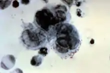 اختبار تزانك إيجابي يبين ثلاث خلايا عملاقة متعددة النوى في المنتصف ("خلايا تزانك").