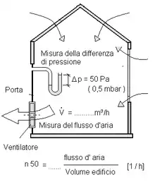 اختبار منفاخ الباب تسمح بقياس مدى إحكام المبنى من خلال قياس فرق الضغط.[1][2][3]هذا الاختبار يكتشف مدى "فقدان الهواء من غلاف البناء" ويُقيم تدفق (أو معدل) استبدال الهواء. ومن الواضح أن القيم المنخفضة (في تسرب الهواء) هي الأفضل.