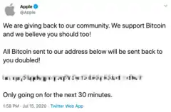 ![]() لقطة شاشة للتغريدة التي نُشرت من حساب شركة آبل على تويتر بعد اختراقه (السطر المُعتَّم هو عنوانُ محفظة البتكوين التي نشرها المُخترِق). | ||||