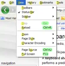 قائمة View في موزيلا فيرفكس وعليها اختصارات لوحة المفاتيح
