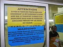 ملصقات تحذيرية في مطار أفريقيا الوسطى مكتوب باللغتين الفرنسية والإنجليزية. (يونيو 2012).