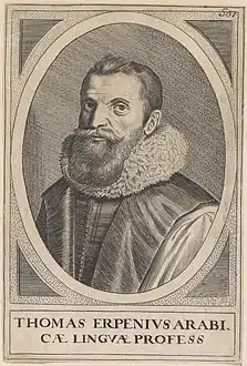 توماس إربنيوس (11 سبتمبر 1584 - 13 نوفمبر 1624) مستشرق هولندي، يعد مؤسس النهضة الاستشراقية ومنظمها في بلاده.[5][6] ولد في جوركم (Gorkum) بهولندا وتعلم في ليدن، وحصل من جامعتها عام 1608 على درجة الماجستير في الآداب. حيث درس اللغات الشرقية. وسافر لاحقا إلى إنجلترا وفرنسا وإيطاليا وألمانيا.