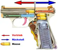 يتسبب ضغط الغاز الناتج عن البارود في توليد قوة الارتداد. وتؤثر تلك القوة لمدة قصيرة على البندقية حيث يعتمد تغير مسيرة قوة الارتداد على تغير ضغط الغاز بعد اشتعال البارود في ماسورة البندقية.