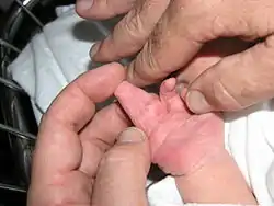 ![]() يد طفل وليد تظهر ارتفاق الأصابع المعقد التام لإصبعين من أصابع اليد. يد طفل وليد تظهر ارتفاق الأصابع المعقد التام لإصبعين من أصابع اليد. | |